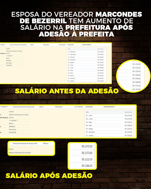 Diante as informações reais do ¨Sagres¨, é um sistema de prestação de contas eletrônica para os municípios e seus órgãos do ¨TCE¨(Tribunal de Contas do Estado da Paraíba), trás a demonstração do parlamentar mirim após essa adesão foi beneficiado por várias benesses da administração além de cargo a uma sobrinha a sua esposa Francisca Erinauda de Araújo Lima é do quadro efetivo do município sendo merendeira escolar, teve o aumento no seu salário de 79,05%, antes de sua vinda a bancada da gestora uiraunense ela recebia o salário de R$ 1.432.20(Um mil quatrocentos trinta e dois reais e vinte centavos), depois de sua adesão mais do que dobrou o valor passando para R$ 2.572,00(Dois mil quinhentos e setenta e dois reais).